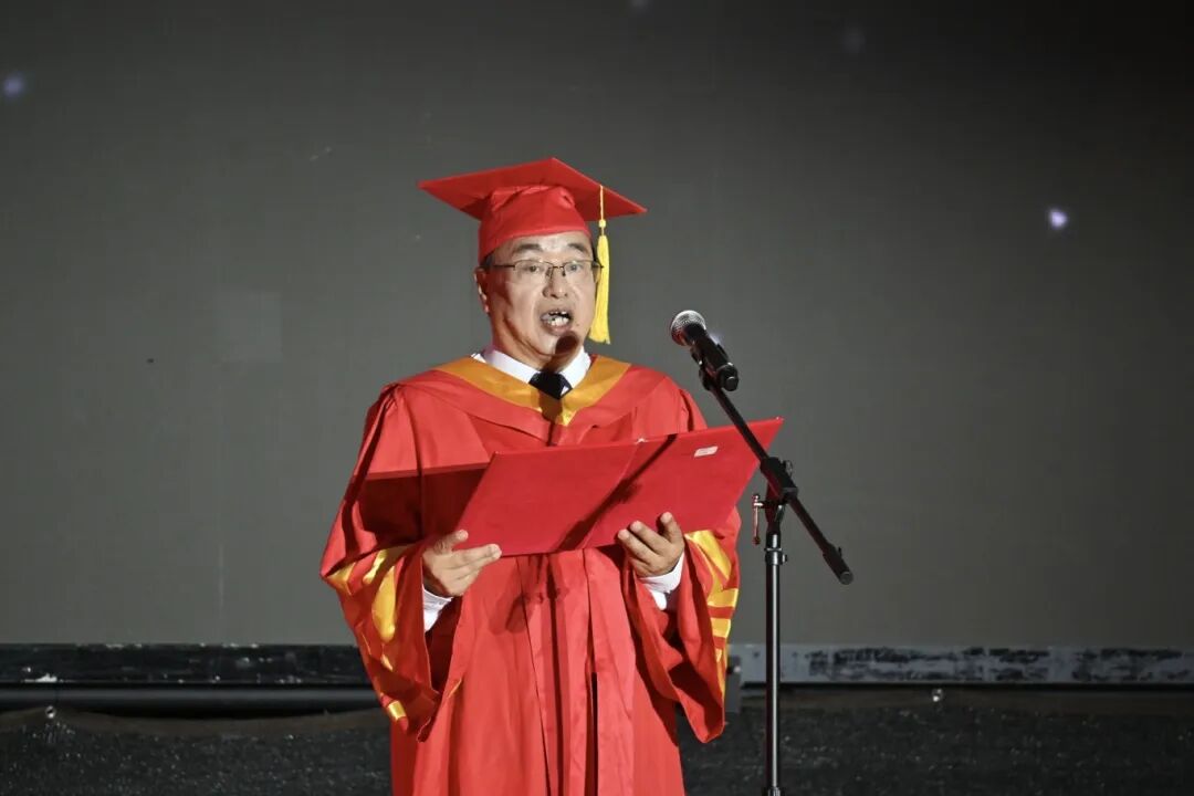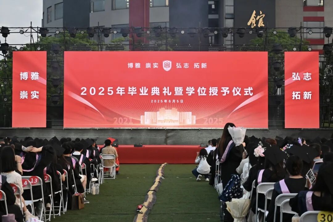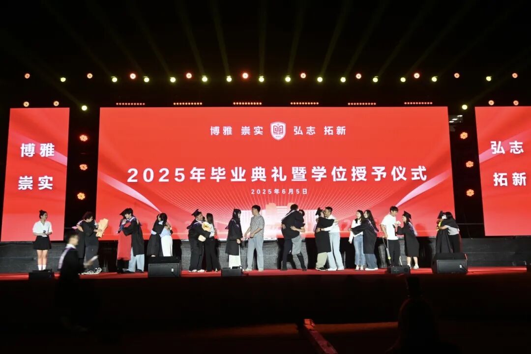 典礼在庄严的国歌声中拉开帷幕。全体师生肃立注目,五星红旗冉冉升起,嘹亮的歌声回荡在运动场上空。校党委书记、教育督导专员郭新力在致辞中深情寄语:“你们即将走出校门,开启崭新的人生篇章。踏出校门,你们便拥有了一个新的身份,作为传媒人,你们手中的镜头、笔杆、麦克风、代码不单只是工具,也是照亮真相的火炬,传递善意的桥梁。”随后,校领导和老师们为毕业生逐一拨穗正冠、颁发学位证书,象征知识与责任的流苏从右至左,定格了学子们四载求学的圆满。