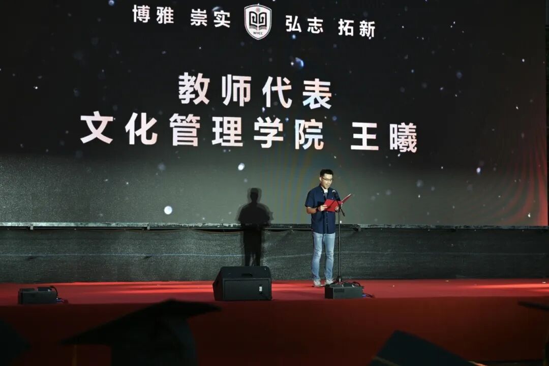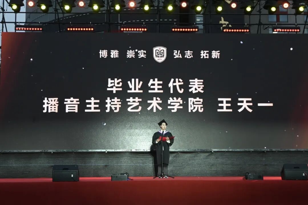 优秀校友代表2017届广播电视工程专业毕业生王昕晨回溯了自己的校园生活。从调试日志到实践拍摄,从图书馆的灯火到演播厅的掌声,他始终记得“要做中国最好的广电工程师”,引发强烈共鸣。“愿你们在汤逊湖畔练就的所有勇气有朝一日能抒写出属于你们的人生高光;愿你们守护好懵懂的18岁初遇传媒时的心跳......”他感谢母校提供的广阔平台,并号召同学以“武传人”的担当,奔赴传媒行业的星辰大海。(以下为王昕晨校友的完整发言内容)
