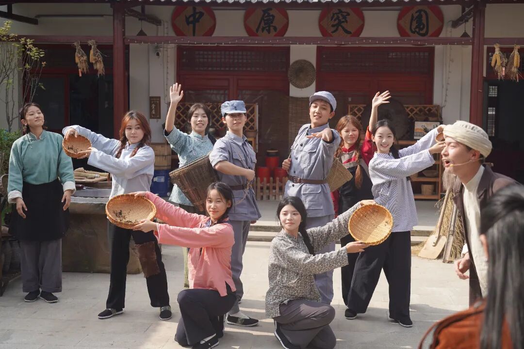 我校表演系一百多名学生作为该剧演员,他们专业投入,不论舞台大小,身上的每一处都是“戏”。当演员贴上花白的胡子,他也就化身成了当年的居住在此的老村民,他的言行举止无时不透露着民众的质朴感。在中原军区大食堂,一场生动的歌舞演出教会了观众辨别“什么是马齿苋?”“何为野菜饭?”军民鱼水情浓在载歌载舞中体现得淋漓尽致。音乐不断,演员们牵起观众的手,团聚一堂跳着欢乐的歌谣。