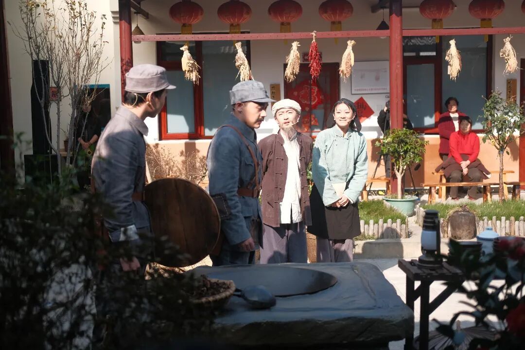 街头小戏持续进行,民众们哼着小曲欢迎远道而来的朋友们;茶棚小二卖力吆喝声中混着战火余温;观众村民同心抓捕特务间谍;代写家书的笔墨落在泛黄信笺上的温情,匠心在流动的舞台、近距离的演绎互动中被鲜活吟唱。