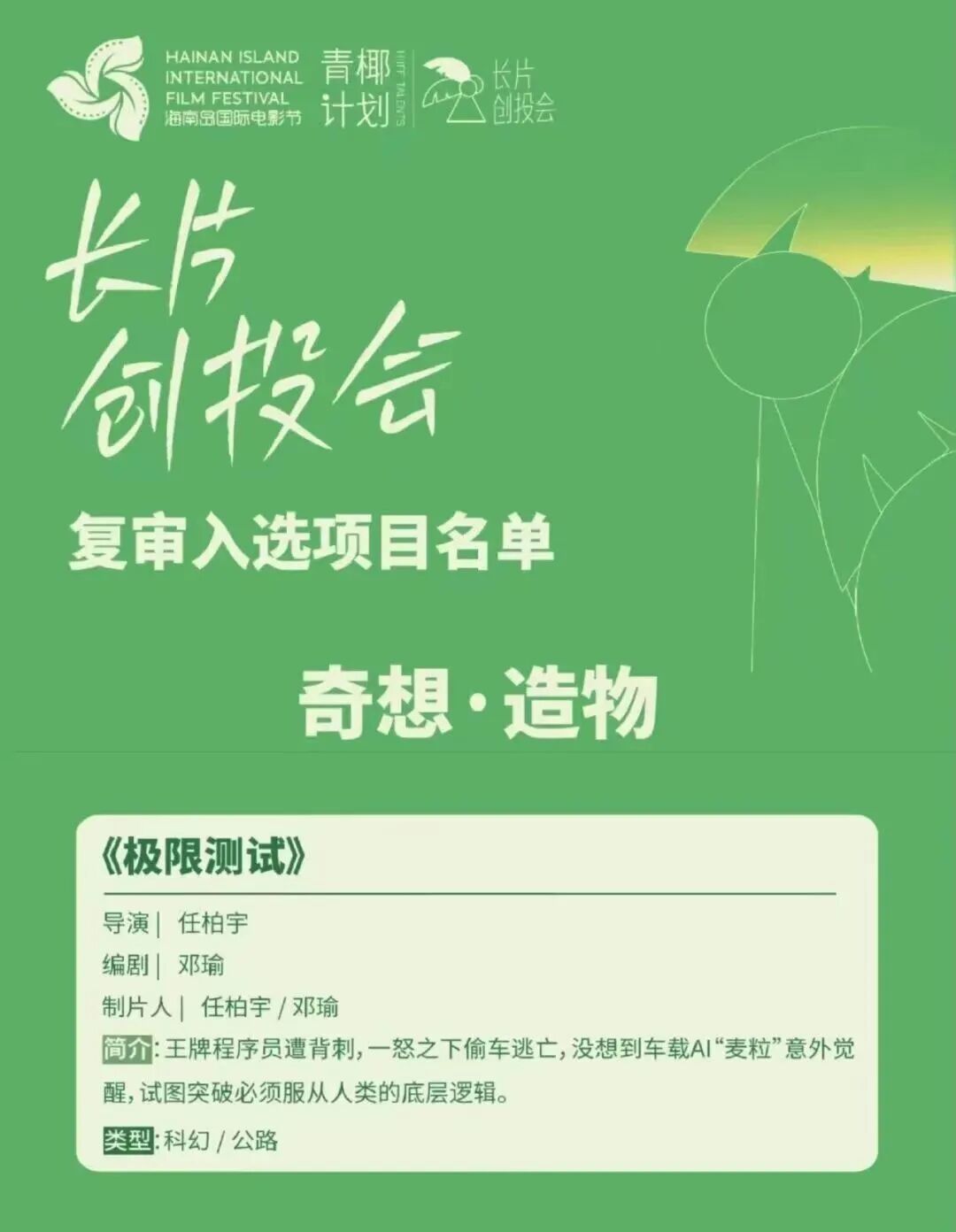 与此同时,在第七届海南岛国际电影节面向华语剧情长片的核心产业板块——“青椰计划”长片创投会中,《极限测试》同样表现优异,成功入围。“青椰计划”旨在为具有潜力的华语剧情长片项目提供从开发、制作到市场推广的全链条产业支持,是发掘和扶持华语影坛新生力量的重要平台。项目双入围,充分证明了其艺术创新性与商业可行性。